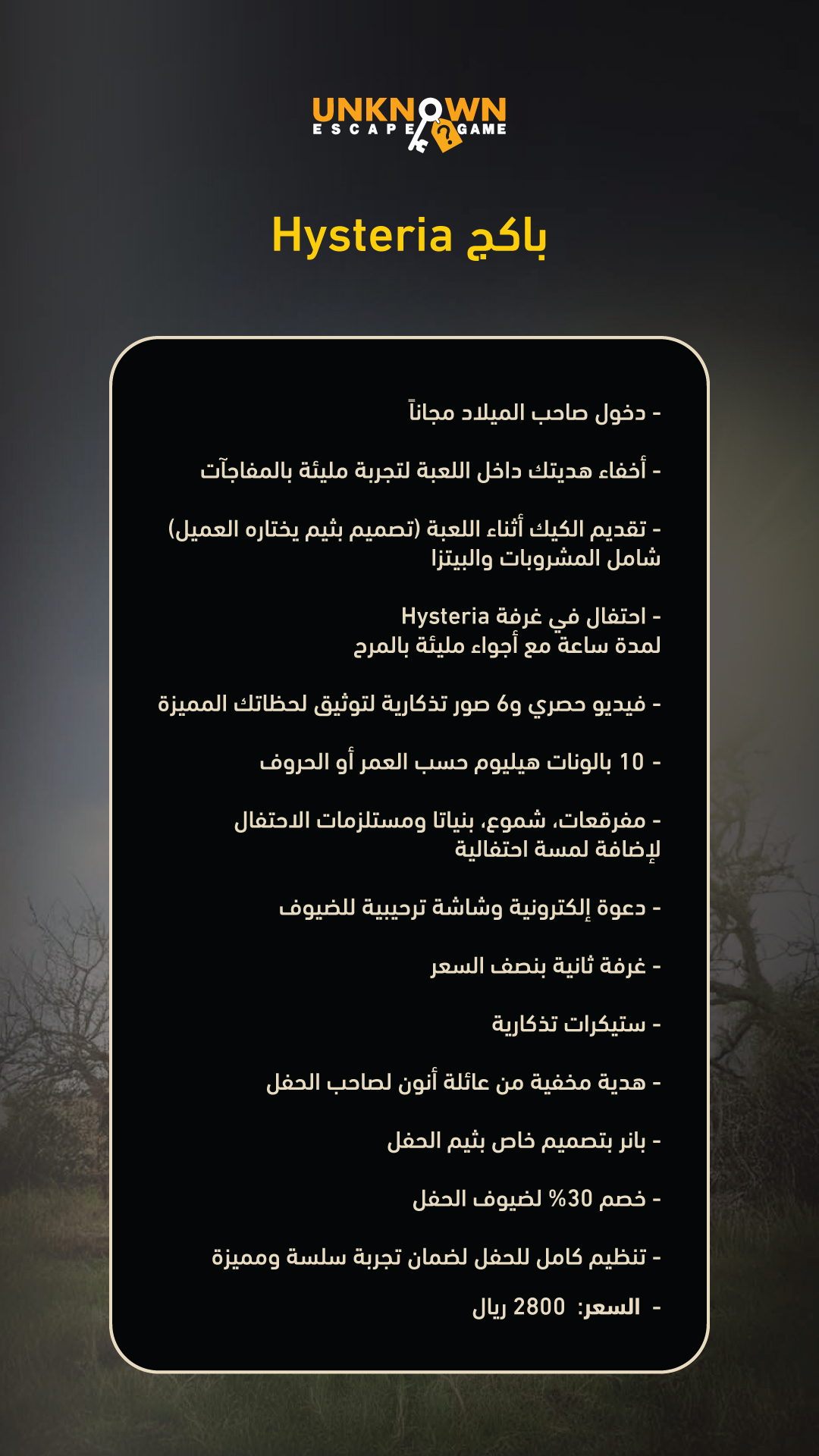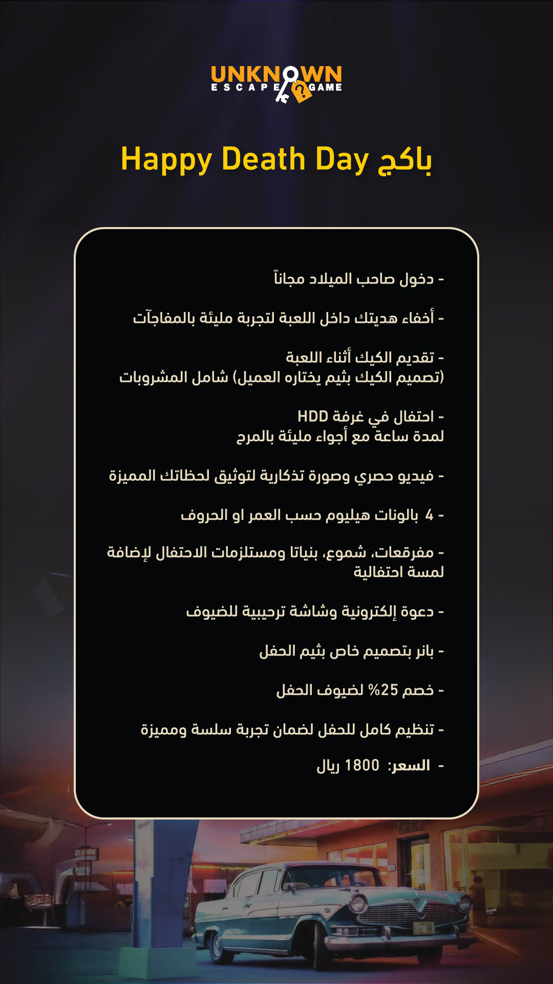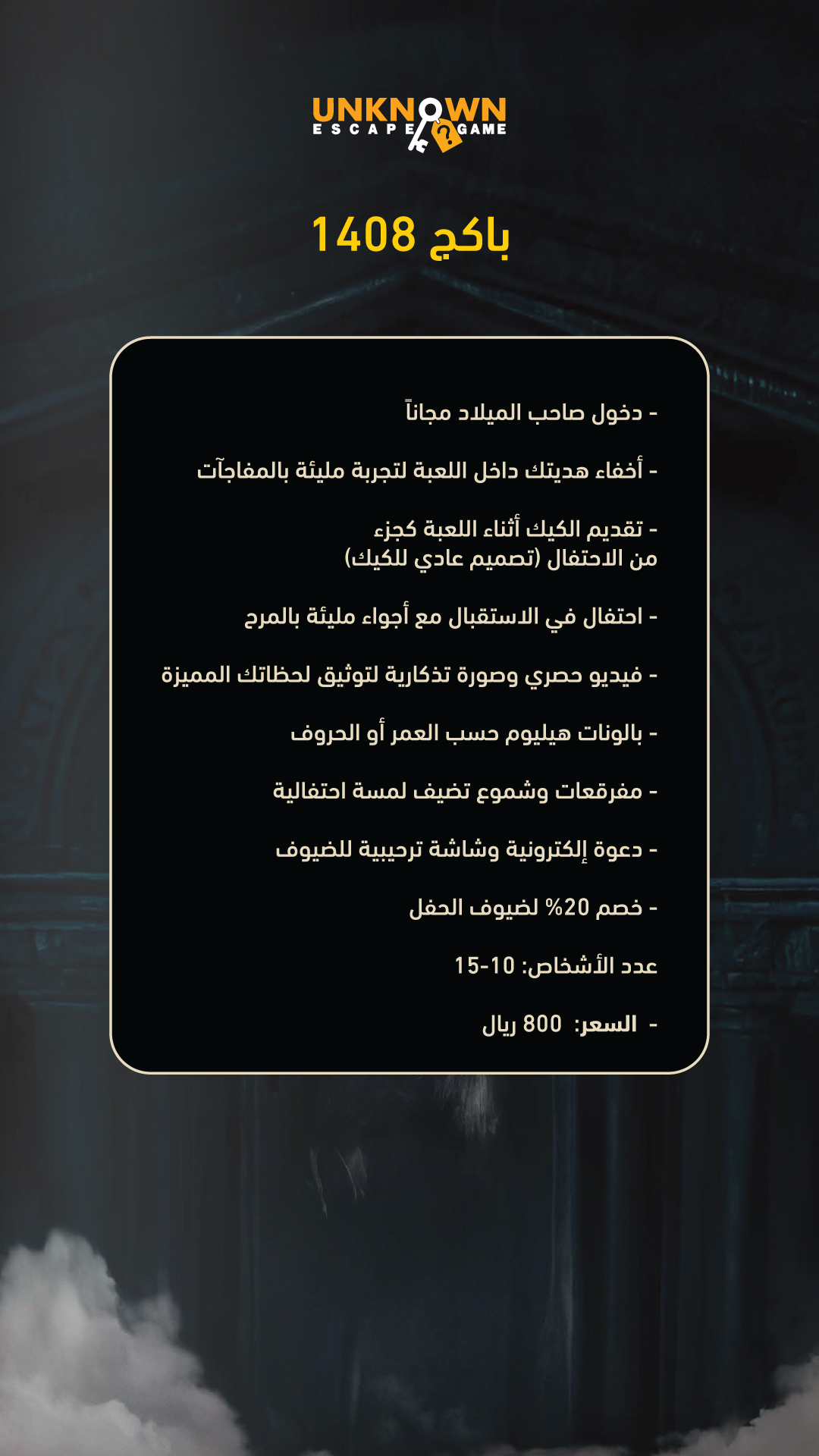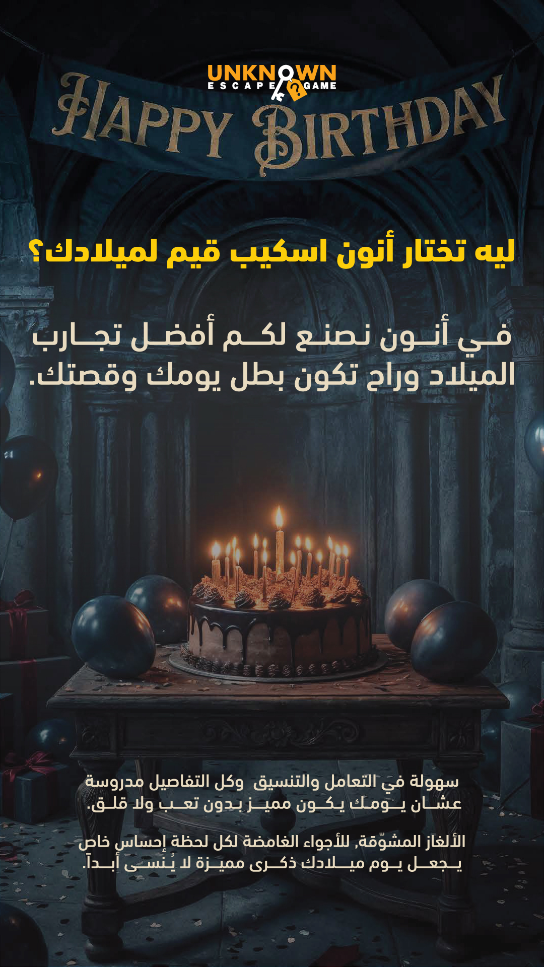 A birthday with us isn’t just a party; it’s a real-life adventure for you and your squad! Get ready for a rush of adrenaline as you crack codes and solve puzzles to find your way out. Our rooms are designed with cinematic sets and special effects that immerse you straight into a horror or action movie experience. Challenge your team’s wits and see who has what it takes to lead the group to victory. This is your chance to break the routine and throw a legendary birthday everyone will talk about for years. Unknown Room is more than a venue—it’s a test of courage… are you ready?